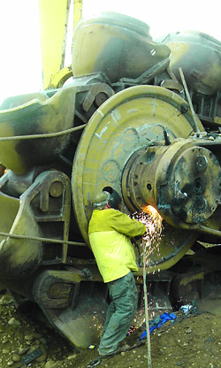 The machine division is responsible for design and fabrication of custom components, repair of worn out dredge components, installation, welding and customization of needed parts. One of our most recent projects completed was the engineering and manufacturing of the "main drive brake" installed on Yuba Dredge No. 17. This is a disc type brake with an 8 foot diameter rotor and 6 - 100 ton brake calipers; this brake is capable of holding the bucket chain weighing 400 tons.